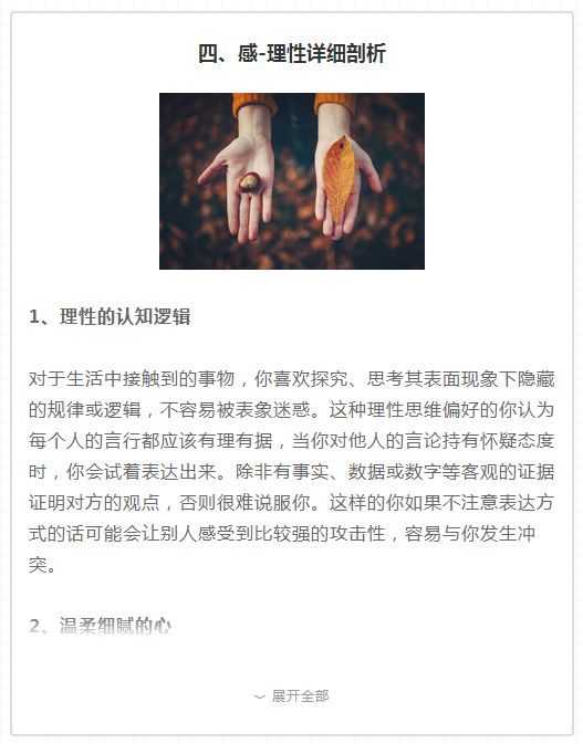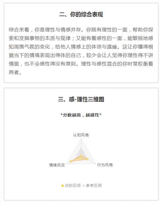 ※本次测评将从认知风格、情绪反应、行为风格三方面来综合评估你感性-理性的程度,并根据你的结果,提供协调两者的建议,帮助你成为一个感性与理性并重的人。