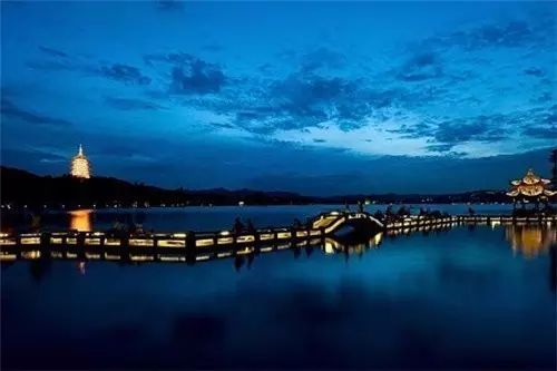 三潭印月是西湖三岛之一,也是自古以来的赏月胜地。三个石塔,亭亭玉立在波光潋滟的湖面上。每逢月夜,特别是中秋佳节,在塔里点上灯烛,洞口蒙上薄纸,灯光从中透出,宛 如一个个小月亮,倒影湖中。待到皓月中天,月光、灯光、湖光交相辉映,月影、塔影、云影融成一片“一湖金水欲溶秋”的景象。