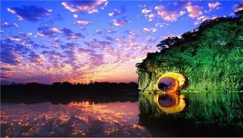 在象鼻山伸入漓江的象鼻与象身之间有一轮通透的石洞——水月洞。该洞与水中倒影宛若一轮水月,一个沉于水底,一个浮于水面,在明月当空之夜,天上月、洞中月、水底月“三月争辉”,形成了桂林山水奇景“象山水月”。