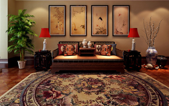 沙发前的地毯,其重要性相当于住宅前用以纳气的明堂,也相当于屋前的一块青草地,宜选用色彩缤纷、构图和谐、鲜艳明快的地毯。
