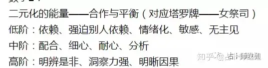 2号是两个整体观的个体,它有十分鲜明的看法。是非很强烈。你说的东西,2号人假如没有听进来,会完全无动于衷。假如听进来了,就会奉为真理。TA可能将不论如何拒绝接受自己的看法。但除非拒绝接受了,也不难发生改变。TA也会整体表现在情感上,不难资金投入一份情感,但除非资金投入就会很坚持。2号还有个明显的整体表现,是倚赖,即使2是需要对立存在的。TA可能将整体表现得倚赖自己或者是讨厌被自己倚赖。也许是在某些地方倚赖自己,在另一些地方讨厌被自己倚赖。比如说,在工作上,TA可能将是个很理智的管理者。但回到家,TA还是像个小孩子。2号人,就像女祭司,本身是十分理智和冷静的。只是,TA会受到2元相对的影响,而整体表现出整体观的一面。