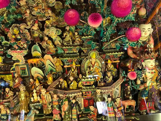 小御花园殿门前矗立“胜利幢”。四面墙壁的绘画内容为 *** 神保护佛法、护佑众生的场景。两边回廊上陈列的野牛、羚羊、猴、猩猩、虎、豹、黑熊等野兽标本,形象逼真,是众 *** 坐骑,它们象征一切恶魔鬼怪已被神征服。主殿佛龛中供奉着“身、语、意、事业、功德”五位 *** 神塑像,象征驱逐 *** 、保护 *** 。两边供奉着“丹坚 *** ”以及五位 *** 神的明妃等。在香火缭绕的大殿左边还有一匹白马标本,相传是九世 *** 却吉 *** (1883-1937年)的坐骑。二层供奉莲花生大师塑像,三层供奉阿底峡师徒三尊等塑像。相对于寺中的其它门拱,小御花园主殿的那些高原动物标本和精美的藏式壁画足以使它成为你此行一次难以忘怀的记忆。