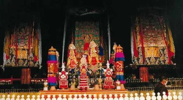 作为扎什伦布寺大 *** 集中诵经的地方性,甘丹寺内设有上千个佛团垫,可供千余大 *** 集体打座诵经。经堂内部陈设非常考究,饰有黄、红、绿、蓝、白五色的幡、帏和各式天花藻井;珍贵的大型堆绣挂佛、刺绣佛满布主殿各个角落;经堂的梁檐上绘有细腻生动的藏式风格的图案花纹。经堂内耸立的大柱也都由龙凤彩云的和田玉包裹。作为扎什伦布寺独创的藏族艺术品种之一的堆绣,甘丹寺内悬挂的“十八罗汉”堆绣艺术品尤其引人注目。扎什伦布寺的堆绣包括刺绣和剪堆两种。它用各色的绸缎剪成所需要的各种形状,如佛塔,人物花卉,鸟兽等,以羊毛或棉花之类充实其中,再绣在布幔上,由于中间突起,有明显的立体感,看上去极具艺术感染力。 作为拥有最多堆绣艺术品的门拱,甘丹寺是值得细细品味的一处建筑物。