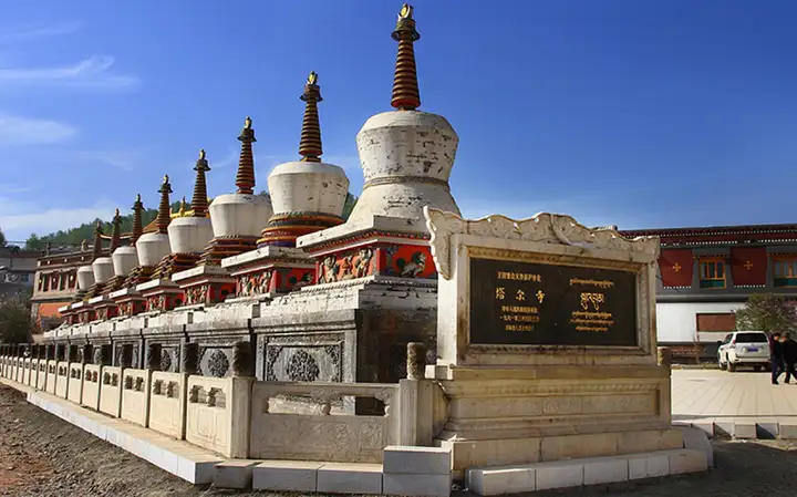 在扎什伦布寺附近的饭馆吃过午饭,便兴冲冲地走进扎什伦布寺。历经宫前广场,远远地看见了八宝如意龙竹。这八个塔所建1776年,据传是为庆祝佛祖释迦牟尼一生之中的八大功德而建造的。其方座尖顶、TG106塔刹的造型大同小异,塔刹白灰抹面,塔刹高6.4米,方座塔底周长9.4米,基座面积5.7万平方米。基座青砖砌,腰部点缀有 *** ,每个塔刹南面还有两个佛龛,里面藏有梵语。龙竹在高原湛蓝天空的映衬下,显得神圣庄严。
