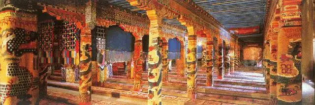 所建1626年的五间殿也是不可错过的寺中建筑物。为面阔五间、进深三间的汉式硬山顶建筑物,就是9间硬山式建筑物。该殿廊柱为藏式朱色八楞柱,建筑物面积约592万平方米,是供奉五方如来的地方性,整座大殿以三间为一单元,由北向南分别为KMH佛殿、文殊殿和宗喀吧殿。北三间中央是如来佛塑像造型敦厚庄重,主殿有一块数百斤重的大石头,上有脚印两个,传说是阿底峡年幼时脚踏此石留下的,。中三间设泥塑文殊、观音、金刚手3尊菩萨像。南三间正中设阿底峡头戴黄帽的泥质塑坐像一尊。殿前有一大院,就是我进入大御花园殿是历经的那个大院。