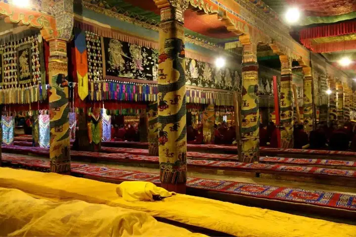 说起扎什伦布寺规模更大的建筑物,非“甘丹寺”莫属。这是一间所建1606年,拥有168根大柱、建筑物面积近2千万平方米的藏式土木结构平顶经堂建筑物。1千多万平方米的屋面上,按照宗教法制和 *** 传统艺术,铜制镏金的金鹿、 *** 、各式宝瓶,佛塔、宝伞和倒钟等点缀构件,把草泥平顶的殿顶渲染得一片金碧辉煌,令人顿生肃然起敬之感。