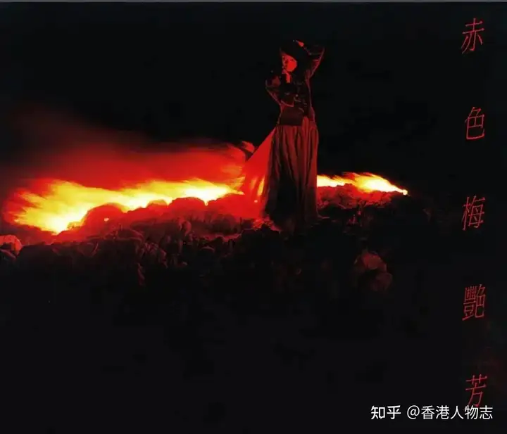 80年代的香港唱片,封面都是清一色的大头像,刘培基另辟蹊径,让梅艳芳穿着裙子站在火堆旁,远远地拍摄了一张剪影。