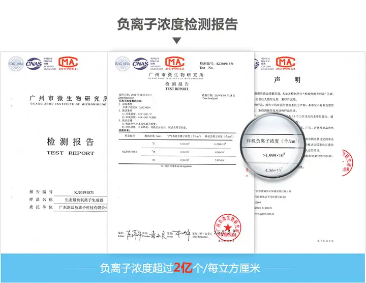 通过以上检测报告也可就看出:阴阳离子对PM2.5的再生率达到了99.8%,自然生态级氙和聚合机能聚合浓度超过2万个/cm³的氙和。