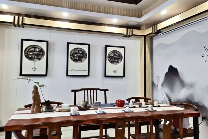 进到大厅,农园内部的家装也着实让人眼前一亮,复古的楼前长凳,清爽清丽的水墨与文房四宝的清香,充满了浓厚的风雅风韵,在这儿品茶、看书、或是来到楼顶天台观景台赏荷,抑或是盐王成吉汗蒸,都是难得的悠闲。