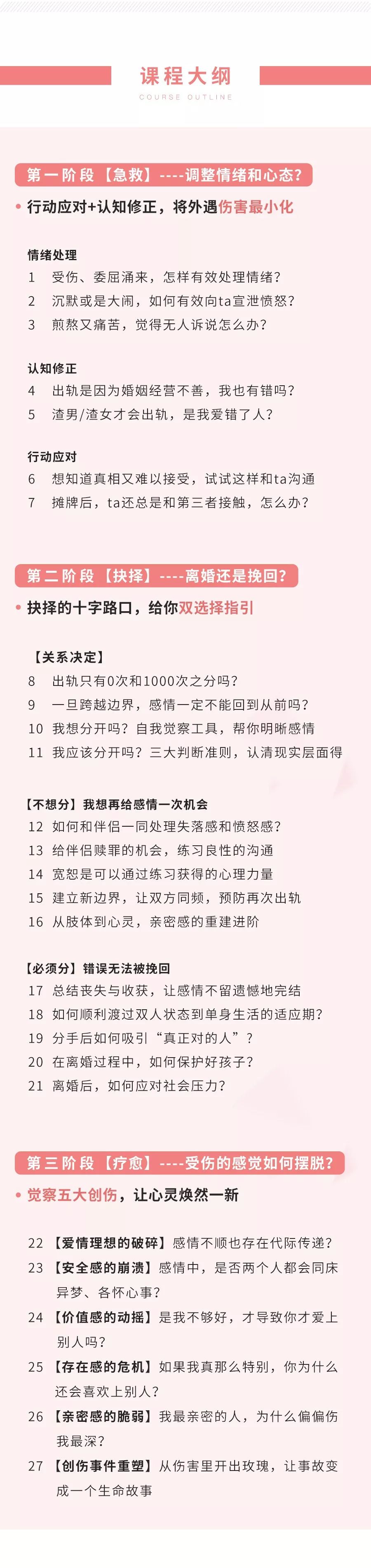 这次,我把近20年来的经验总结起来,希望帮助更多人,用心理学应对出轨危机,从【情绪急救】【明晰选择】【疗愈成长】3步破解婚姻困境,收获崭新的人生: