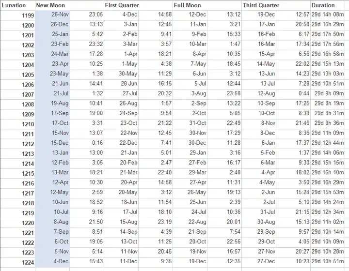 由于非常困难的一步是推算出星象,省去这一部,用网上的统计数据。我省的非官方元宵节选用的是紫金山天文学台的统计数据,不好找。为了模拟方便,布季谢美国海军天文学台的统计数据[2],另付两年的,如果看不出数值: