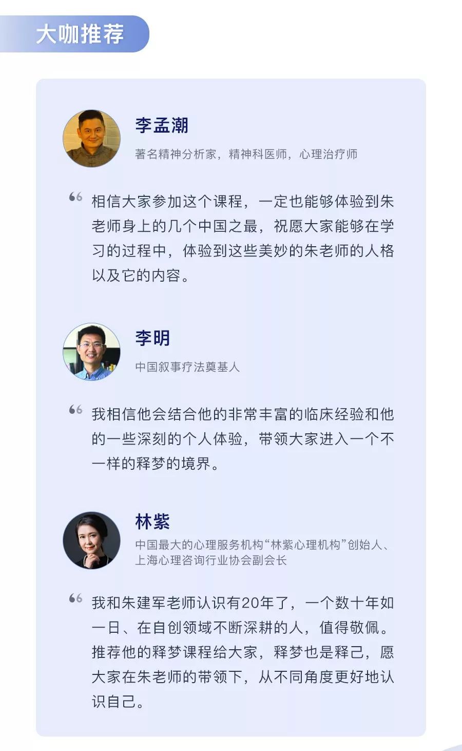 课程包含朱建军老师30年解梦精华,习得释梦技术,可以帮助自己和身边的人解梦,从而了解自己和他人。