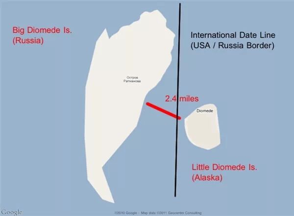 这里有2个岛,一个大Diomede岛,一个小Diomede岛。俄罗斯拿了大的,而小Diomede岛属于美国的 *** 斯加,两个岛中间之隔2.4英里。国际日期变更线就在这2个岛之间,你要是从一个岛看另一个岛的人的话,你会发现他们活在昨天,而他们看你是活在明天的人。