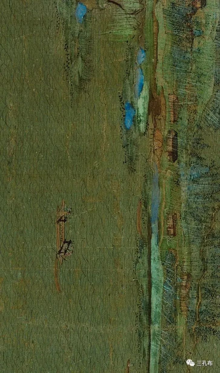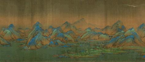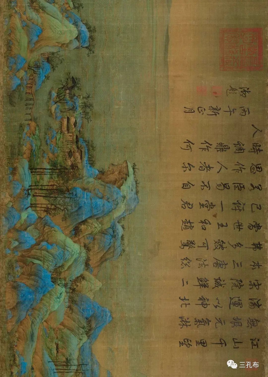 “政和三年闰四月八日赐。希孟年十八岁,昔在画学为生徒,召入禁中文书库,数以画献,未甚工。上知其性可教,遂诲谕之,亲授其法,不逾半岁,乃以此图进。上嘉之,因以赐臣京,谓天下士在作之而已。”