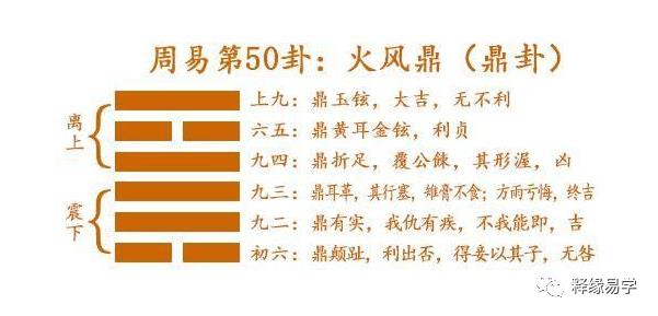 《象辞》说:本卦下卦为巽,巽为木;上卦为离,离为火。可见木上有火,以鼎烹物,这是《鼎》卦的卦象。